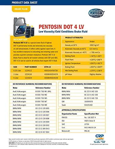 - Pentosin DOT 4 LV is a special brake fluid of highest DOT 4 performance levels and extremely low viscosity at cold temperatures