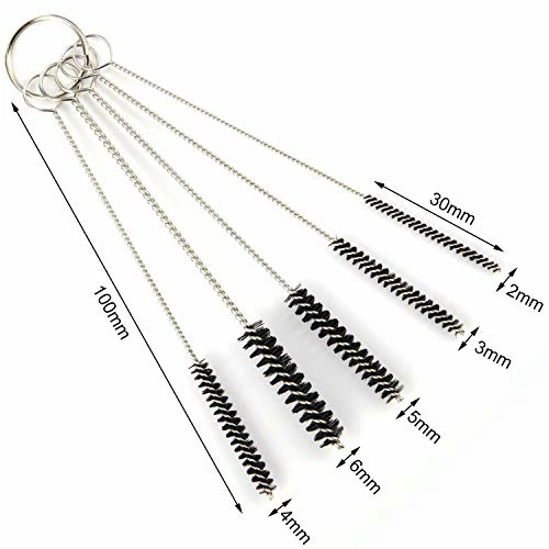 - Size: the diameter of stainless steel needle cleaning tools are 1.1 mm, 1.4 mm, 1.6 mm, 1.8 mm and 2.1 mm; The diameter of stainless steel nylon brush includes 2 mm, 3 mm, 4 mm, 5 mm and 7 mm, and all of their overall lengths are 11 cm, including brush size of 3 cm; The size of oil cleaner box is about 10.2 x 2.3 x 1.2 cm